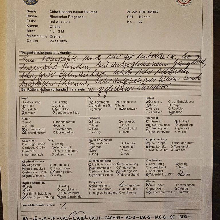 Unsere Hündin Chita Upendo ist am 12.09.2021 geboren. Kein Hinweis auf HD , ED oder Hämophilie. Das gleiche ist ebenfalls bei unserm Deckrüden Kabayo